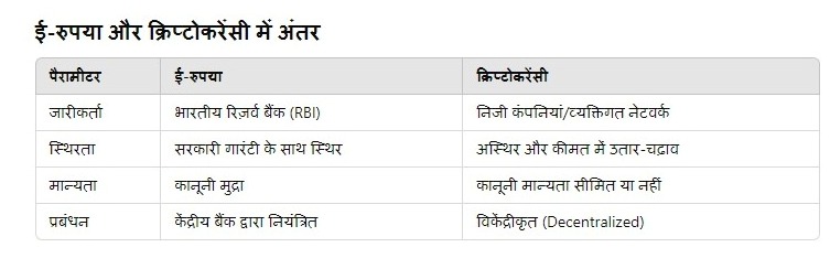 1. डिजिटल रूप में सरकारी मुद्रा: ई-रुपया भारतीय रुपये का डिजिटल संस्करण है, जिसका मूल्य सामान्य रुपये (₹) के बराबर है।